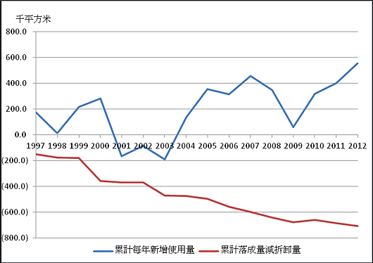 累計每年新增使用量及累計淨拆卸量
