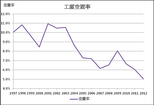 由於用途不斷擴闊 <3> 且面對需求向下流的趨勢下<4>,對工廈的需求持續上升,近十多年空置由高位的11% 跌至2012年末的5%,詳細數據會在下文分析。