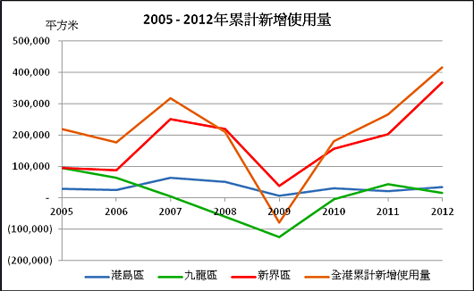 另一方面,由2005年起,當年新增需求量其實可以分開港島、九龍及新界去統計及計算。整體而言,由2005 - 2012年,全港累計新增使用量為416,500平方米,其中新界區表現一枝獨秀,這8年內累計新增使用量為367,400平方米,新界區的新增需求大幅跑贏港島及九龍,主要原因可能與新界區較近內地有關,詳細數據可參閱圖五。