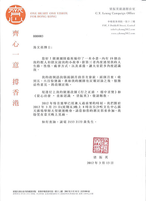 昨天收到你的來信,和競選政綱,有多少突然,快閱過閣下政綱後,我相信如果由你出任特首,香港、香港人是有得著。不過,政綱還政綱,是講易行難,要做到,一定要港人配合,這就要看閣下的功力。