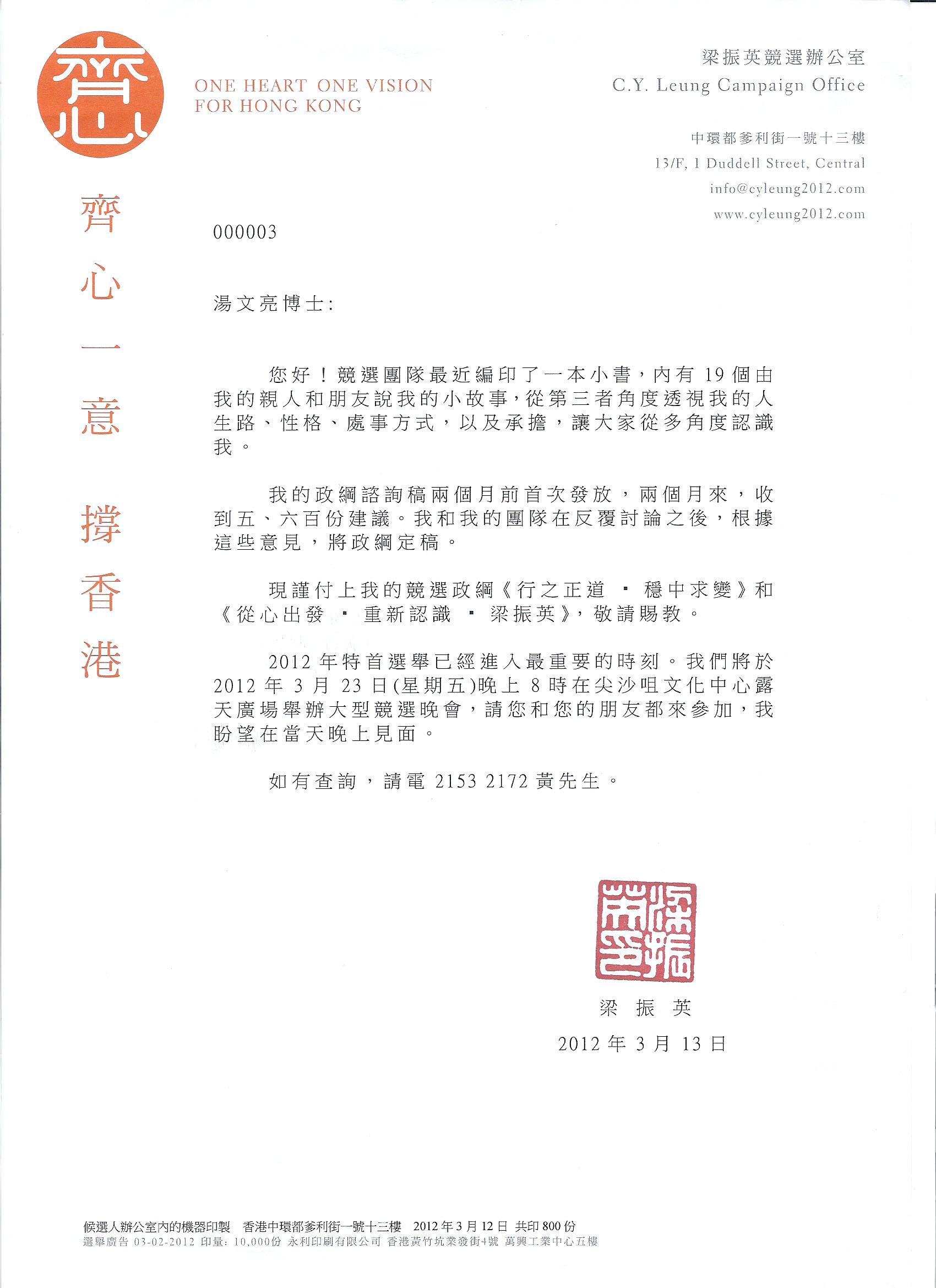 首先預祝閣下今晚造勢晚會成功,繼而與唐英年先生在3月25日特首決戰中表現突出,雙方以「君子之爭」來競選今次特首寶座。謹此,預祝成功。